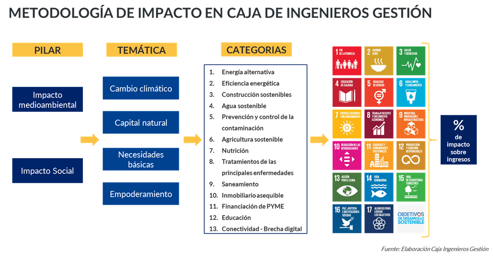 La metodología de impacto de Caja Ingenieros Gestión recoge datos del proveedor de referencia MSCI ESG Manager y replica su metodología basándose en dos pilares principales: Impacto medioambiental e Impacto social. Estos pilares abordan temáticas como el cambio climático, el capital natural, las necesidades básicas y el empoderamiento. A partir de estas temáticas, se identifican 13 categorías clave, como la energía alternativa, la agricultura sostenible y la educación, que se alinean con los Objetivos de Desarrollo Sostenible (ODS). El impacto de las inversiones se mide en términos de contribución a los ingresos de las compañías en relación con los ODS correspondientes.