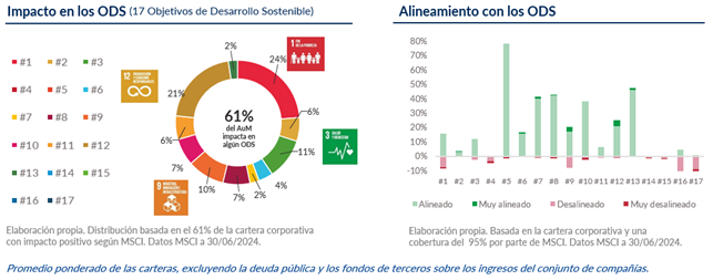 Los siguientes gráficos presentan un análisis del impacto y alineamiento del conjunto de nuestras carteras corporativas con los Objetivos de Desarrollo Sostenible (ODS), utilizando datos de MSCI y CI Gestión.