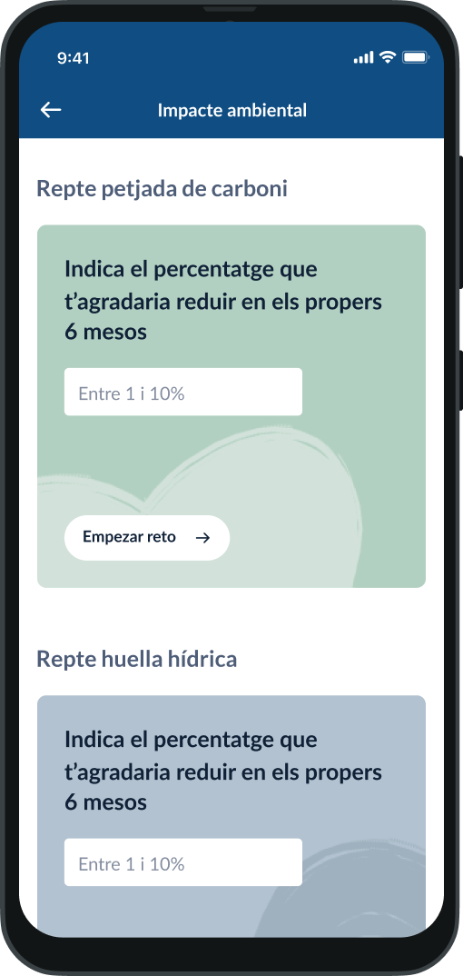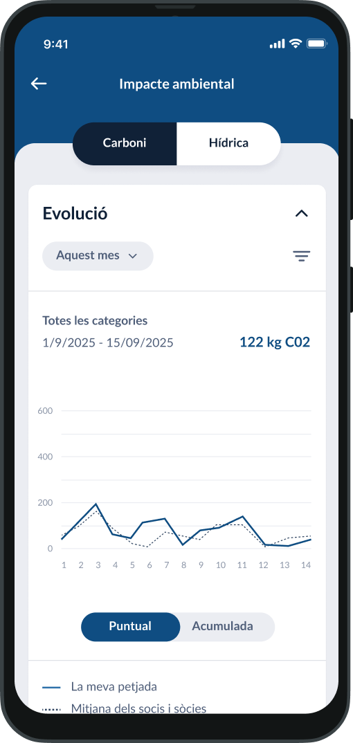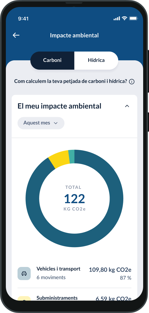 Un servei dins de Les meves Finances que et proporciona informació sobre la petjada de carboni i hídrica generada pel consum de les teves targetes i rebuts bàsics.