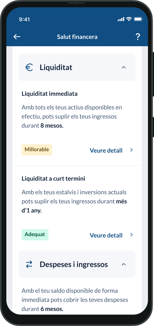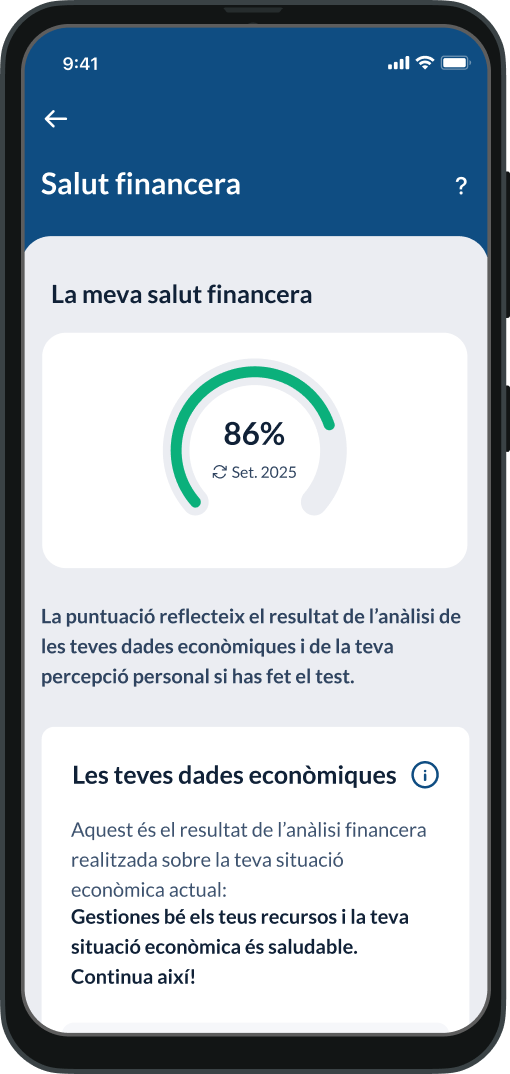Descobreix en Les meves Finances, el servei que combina dades objectives i percepcions personals per a ajudar-te a entendre, mesurar i millorar la teva salut financera, amb indicadors clars i consells personalitzats, perquè cuidis la teva salut financera tant com ho fas amb la física i la mental.