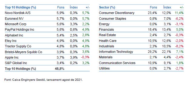 Recurrentment, aquestes companyies es beneficien de tendències seculars de creixement entre les quals destaquen l'eficiència energètica, el comerç electrònic, el processament de pagaments electrònics, l'envelliment de la població o la urbanització en països emergents, entre d'altres. L'estratègia passa per avaluar com les empreses redistribueixen aquests beneficis externament (medi ambient, comunitat), però també internament (empleats, clients, proveïdors, òrgans de govern, etc.), i per a això les mètriques extrafinanceres cobren una importància vital.