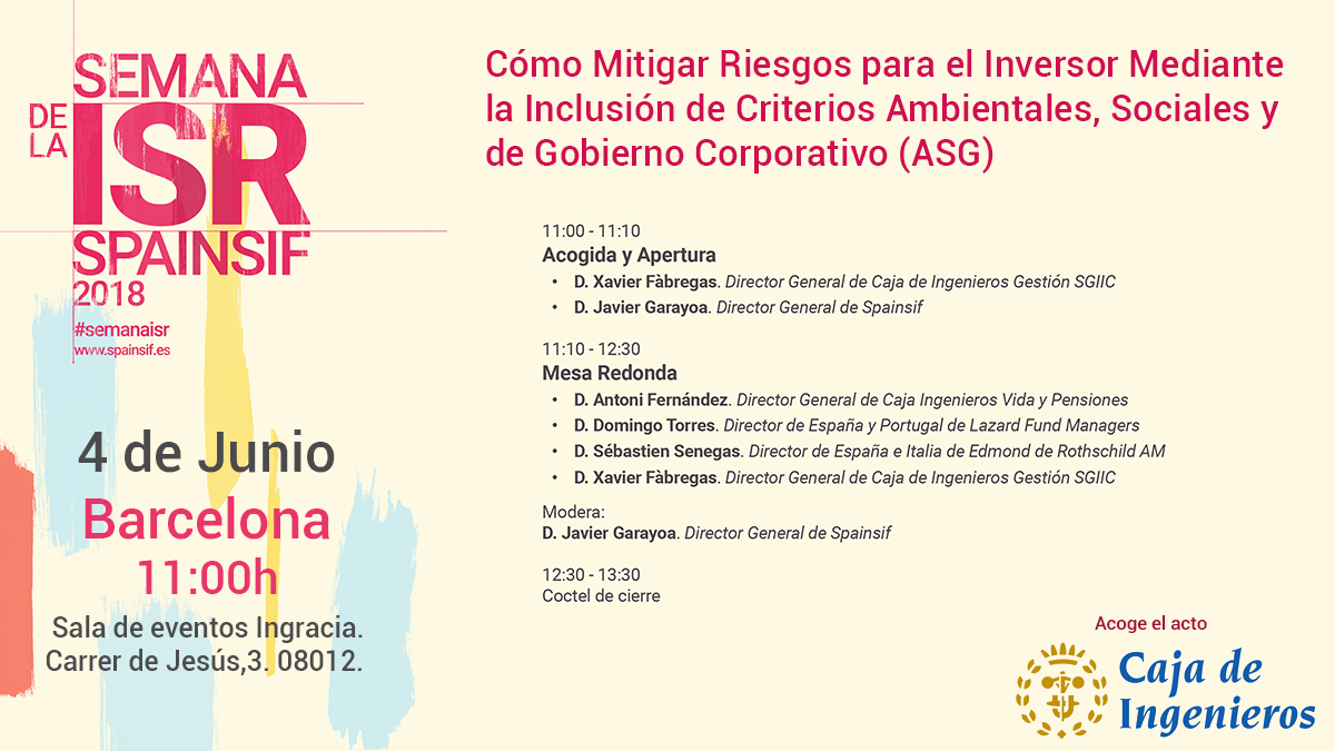 Caixa d'Enginyers formarà part de la Setmana de la ISR Spainsif 2018 amb l'organització de la taula rodona "Com mitigar riscos per a l'inversor amb la inclusió de criteris Ambientals, Socials i de Govern Corporatiu (ASG)".