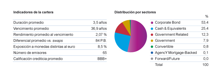 - Distribución de activos. La inversión se focaliza en valores de renta fija emitida por emisores públicos y privados sin predeterminación de sectores o países. Se incluyen, dentro del universo de inversión, gobiernos y compañías radicados en países en vías de desarrollo. Esta libertad de movimientos elimina restricciones con el objetivo de maximizar el binomio rentabilidad/riesgo.