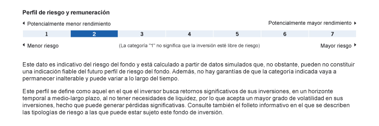 Este dato es indicativo del riesgo del fondo y está calculado a partir de datos simulados que, no obstante, pueden no constituir una indicación fiable del futuro perfil de riesgo del fondo. Además, no hay garantías de que la categoría indicada vaya a permanecer inalterable y puede variar a lo largo del tiempo.